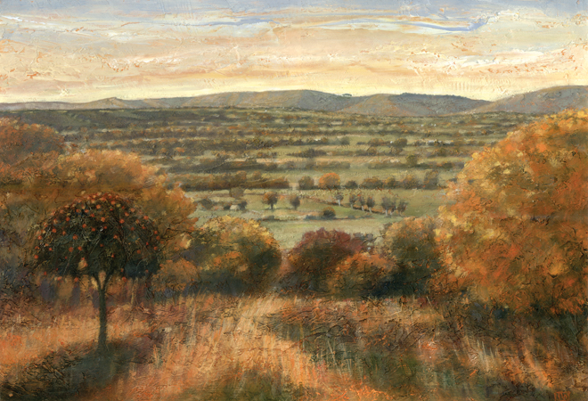 JEAN WINTER media: Inkjet Print £ threetrees David commissioned Jean to capture an aspect of the view from the hill where the gallery is based and high quality ink jet lightfast prints on German etching paper will be available for sale at this year's VFTH exhibition. Living in a county with strong associations with the apple, has inevitably influenced JEAN WINTER'S paintings. Her work reflects the mystery, space and colour of the Somerset landscape where she lives and paints. Her work is widely exhibited and collected in the South West, and we are highly delighted to be able to have some of her prints and 3 small paintings at this year's VFTH exhibition. At VFTH exhibition 17 paintings on wood or canvas will be available for sale ranging in price from £98 - £490.